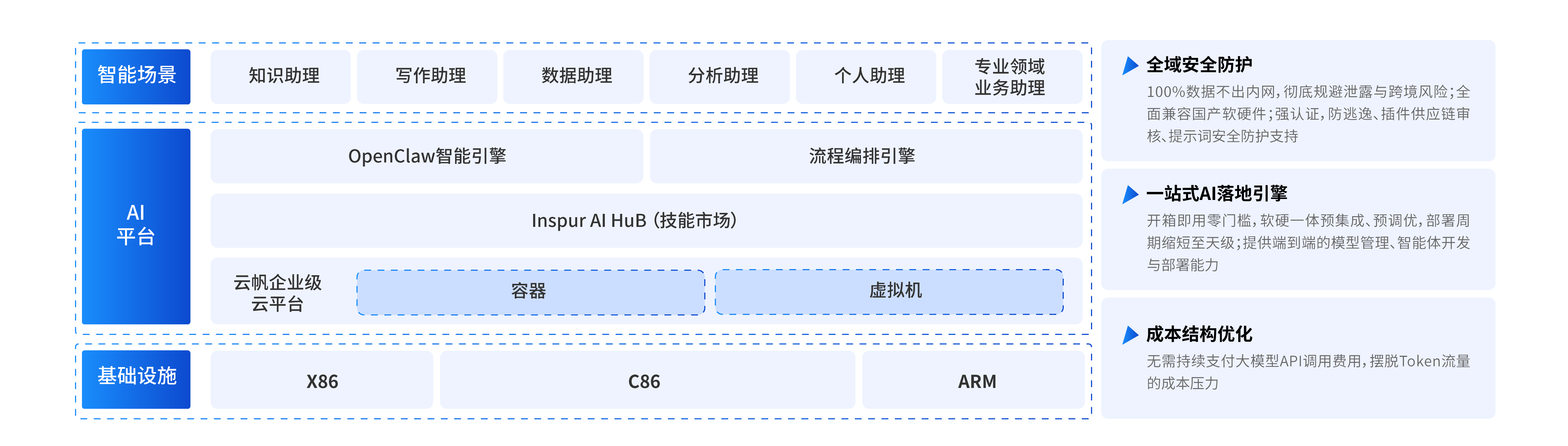 通过“本地云+边缘端”的混合部署架构,聚焦AI原生应用的安全落地与高效运营,全面覆盖全场景业务需求,并推出OpenClaw(龙虾)五大护航举措,助力千行百业零门槛拥抱AI智能体,推动AI技术从概念走向实际生产力。