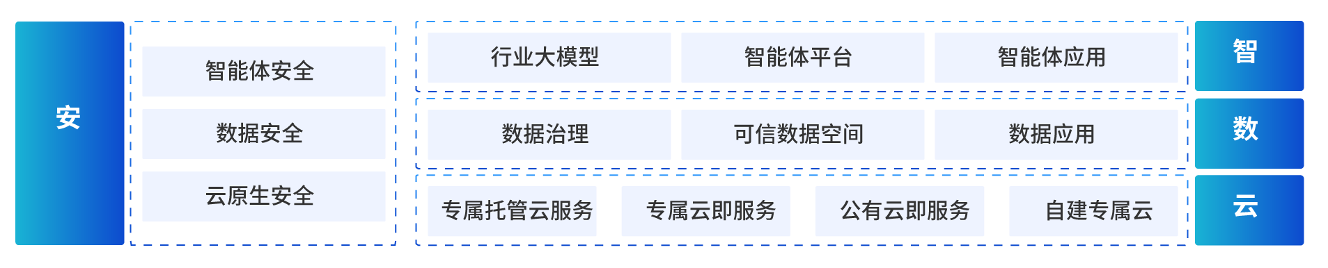 安全层布局智能体、数据、云原生全维度安全防护,筑牢核心安全屏障;智能层以行业大模型为核心,联动智能体平台与应用,打造智能体化核心能力;数据层围绕数据治理、可信数据空间与数据应用,夯实数据价值底座;云层提供专属托管、专属云、公有云等全场景服务,结合全国算力基建布局,为各业务提供稳定云资源支撑,实现安全、智能、数据与云服务的一体化落地。