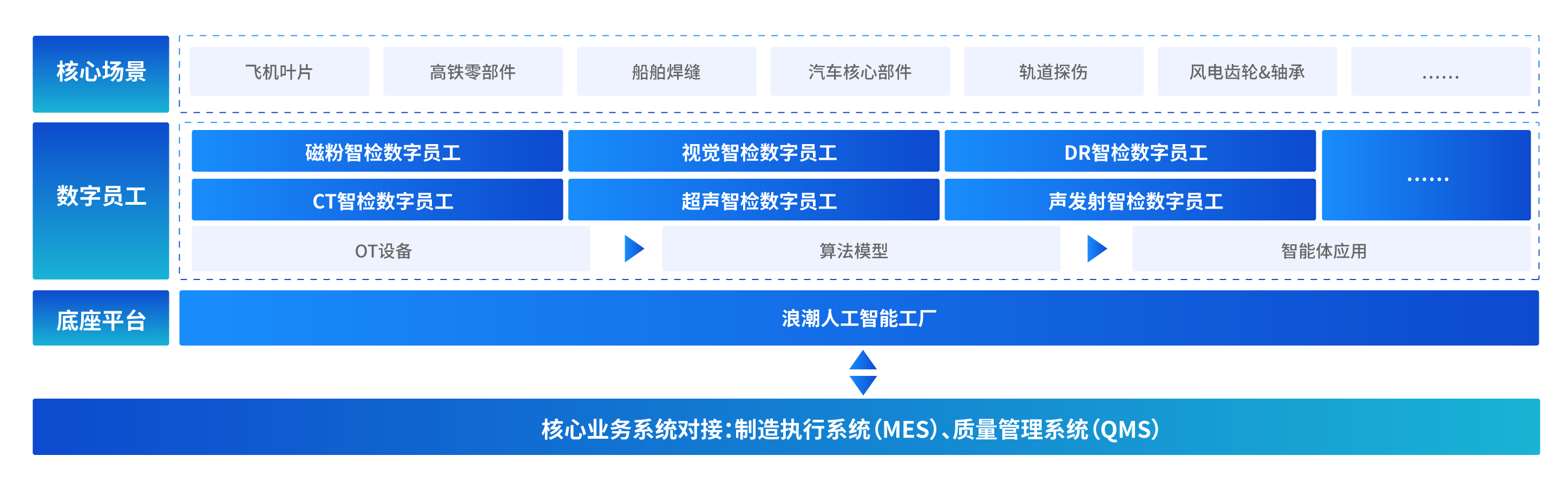 依托浪潮人工智能工厂,建设人工智能质检平台(企业质检大脑),与企业现有业务系统(MES/QMS)深度融合,设计开发AIoT一体化人工智能解决方案,面向飞机叶片、高铁零部件、船舶焊缝、钢轨探伤等高端设备检测场景,构建“检测发现问题 → 分析定位根源 → 反馈优化生产”的闭环管理机制。