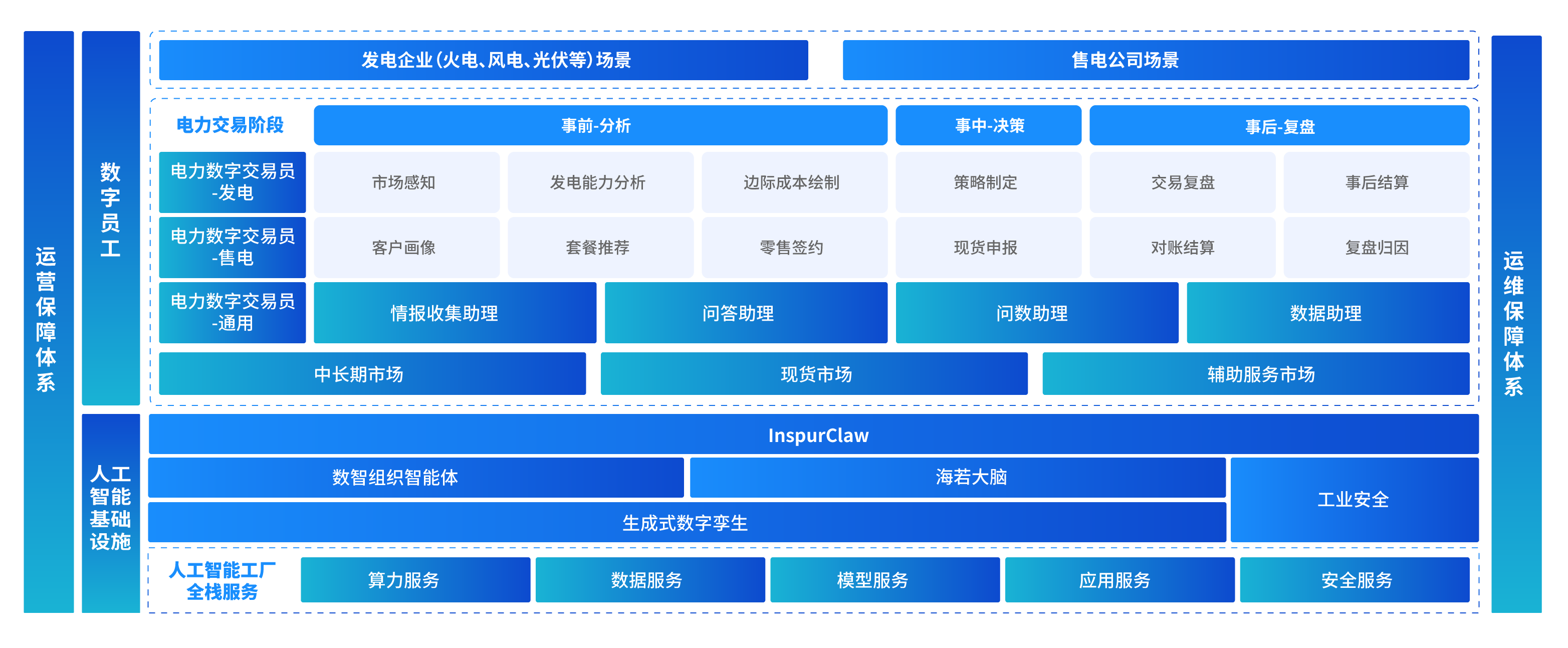 基于浪潮人工智能工厂和分布式智能云,面向国家级、省级、地方发电集团、各类售电公司等重点客户,提供电力行业模型和电力数字交易员等服务,赋能电力市场经营主体高质量发展。