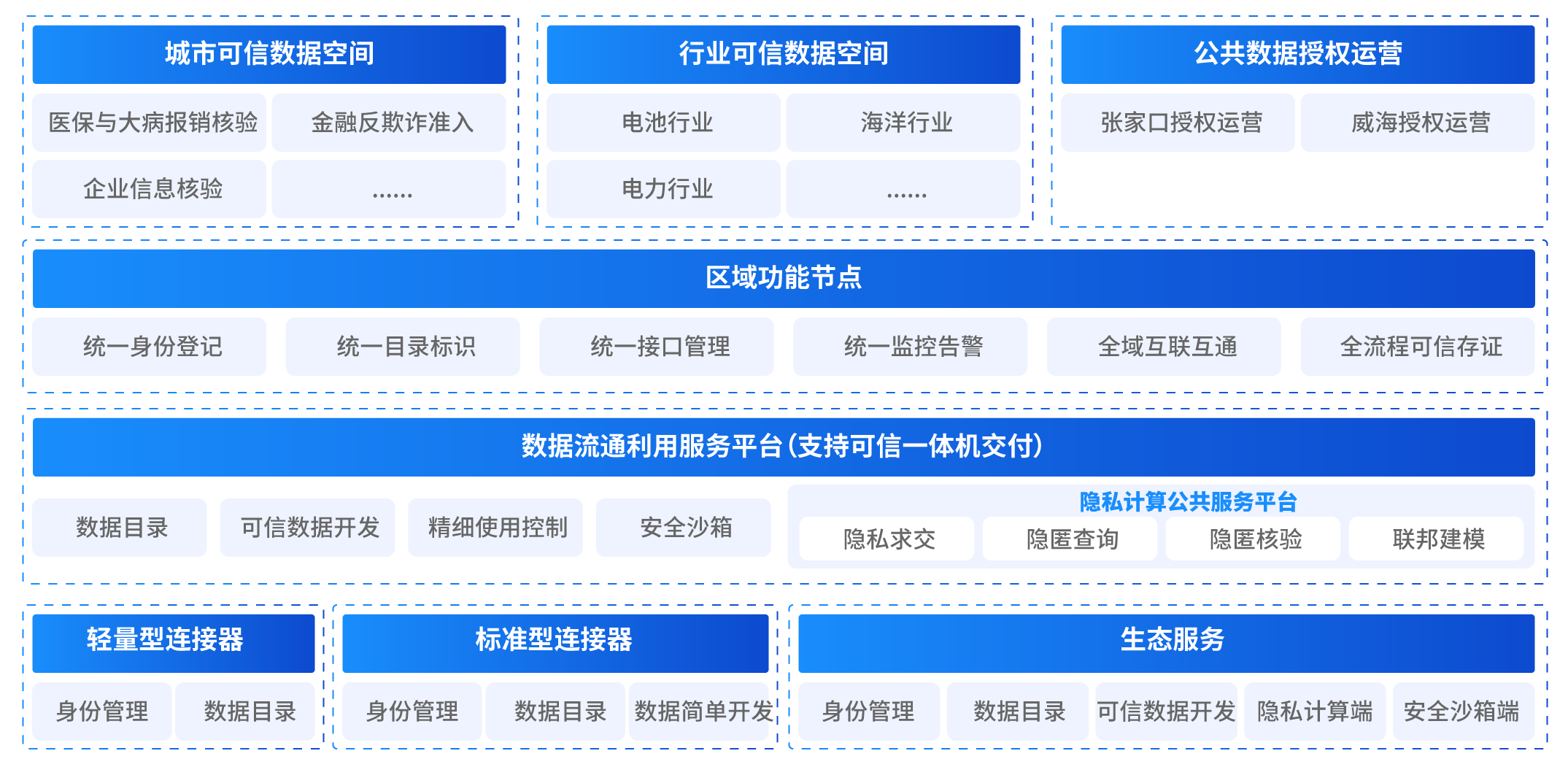 提供数据接入、隐秘存储、加密传输、密态计算、使用控制、计量计费、存证审计等数据流通全过程服务,实现了用户“一点接入、全国通行”,数据“一点发布,全域可见”,应用“一点部署,跨域通用”。