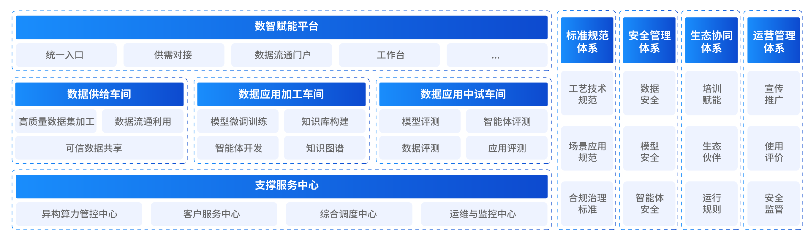 平台采用创新的“两中心、三车间”架构。需求中心将模糊业务需求转化为可执行项目;数据加工车间将原始数据提炼为高质量数据集;智能体生产车间提供零代码编排与模型训练工具,敏捷开发AI应用;测试评估车间构建三级测评体系,确保智能体可靠安全;运营中心提供7*24小时运维、全链路安全护盾及产业生态运营。五大模块协同,实现智能体的标准化、规模化生产与全生命周期管理。