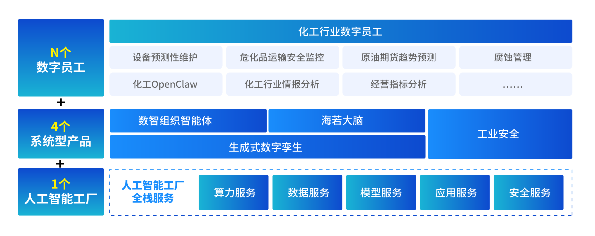 基于人工智能基础设施,构建“1+4+N”架构体系,为客户提供1个人工智能工厂、4个系统型产品、N个数字员工,打造化工行业人工智能数智化解决方案,赋能化工企业降本增效、安全可控、绿色转型。